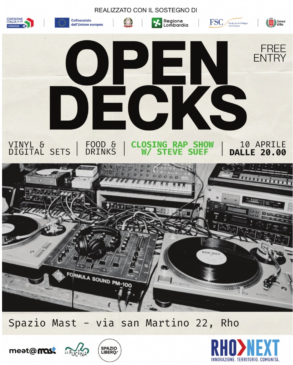 Open Decks, the format dedicated to the local music scene that focuses on young DJs and emerging artists, is finally back. The event will take place on Thursday, April 10th at Spazio MAST starting at 8:00 PM. The evening will be entirely dedicated to underground electronic music, with a line-up made up of local artists. The DJs of the Spazio Libero collective will alternate at the console with 40-minute sets each: Claudio Raimondi, Pharogamo, Onussen666, The Opposiz back-to-back with DuskBeat, Matteo Ria, Dave Load, and Enigma. Closing the evening will be a rap live performance with the release of original tracks by Steve Suef, scheduled as a special moment outside of the DJ set lineup.
