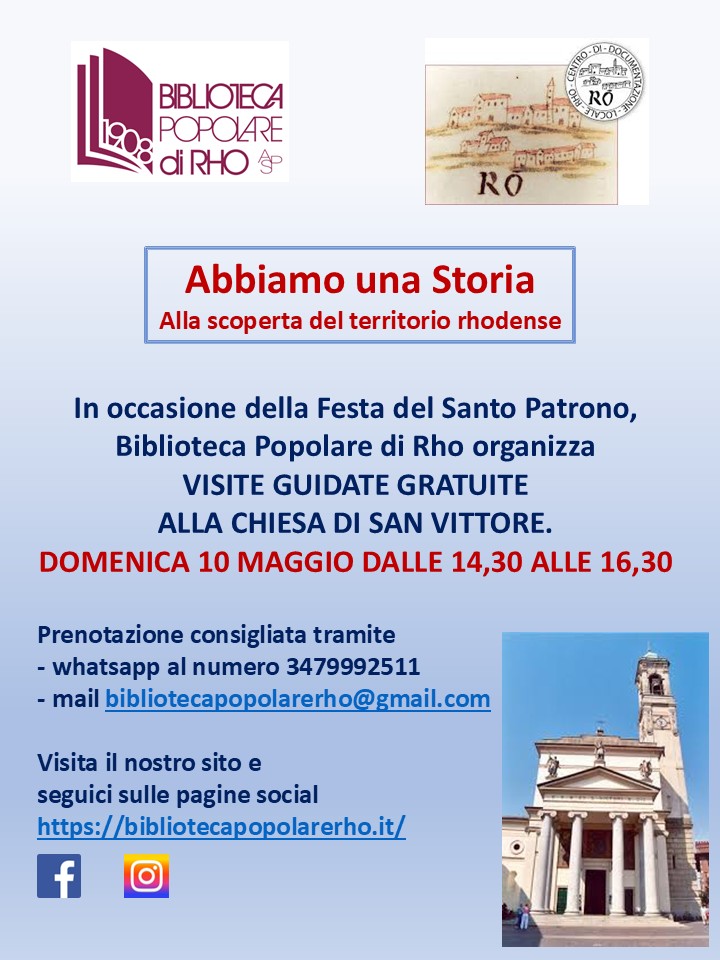 In occasione della Festa del Santo Patrono, la tradizionale Sagra di San Vittore, che si terrà Domenica 10 Maggio, la Biblioteca Popolare di Rho organizza visite guidate alla Chiesa Parrocchiale San Vittore di Rho situata nella piazza omonima. Le visite partiranno alle ore 14,30 e per potervi partecipare sarà obbligatoria una prenotazione tramite mail all’indirizzo bibliotecapopolarerho@gmail.com o tramite messaggio whatsapp al numero 3479992511.