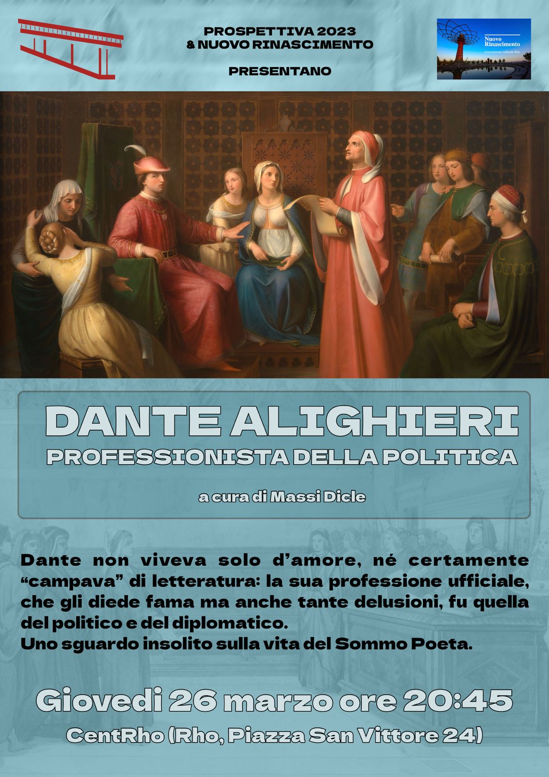 Dante non visse solo di letteratura: la sua professione ufficiale, che gli diede fama ma anche tanti dolori, fu quella del politico e del diplomatico. Questi due aspetti della sua vicenda umana sono profondamente intrecciati tra loro, al punto che non è possibile scindere la sua opera letteraria dalla esperienza politica. In occasione del Dantedì ce ne parla Massimiliano Di Clemente, offrendoci uno sguardo insolito sulla vita del Sommo Poeta. L’incontro organizzato dalle associazioni Nuovo Rinascimento di Rho e Prospettiva 2023 di Arese si svolgerà Giovedì 26 Marzo, alle ore 20:45, presso il Tourist Infopoint CentRho.