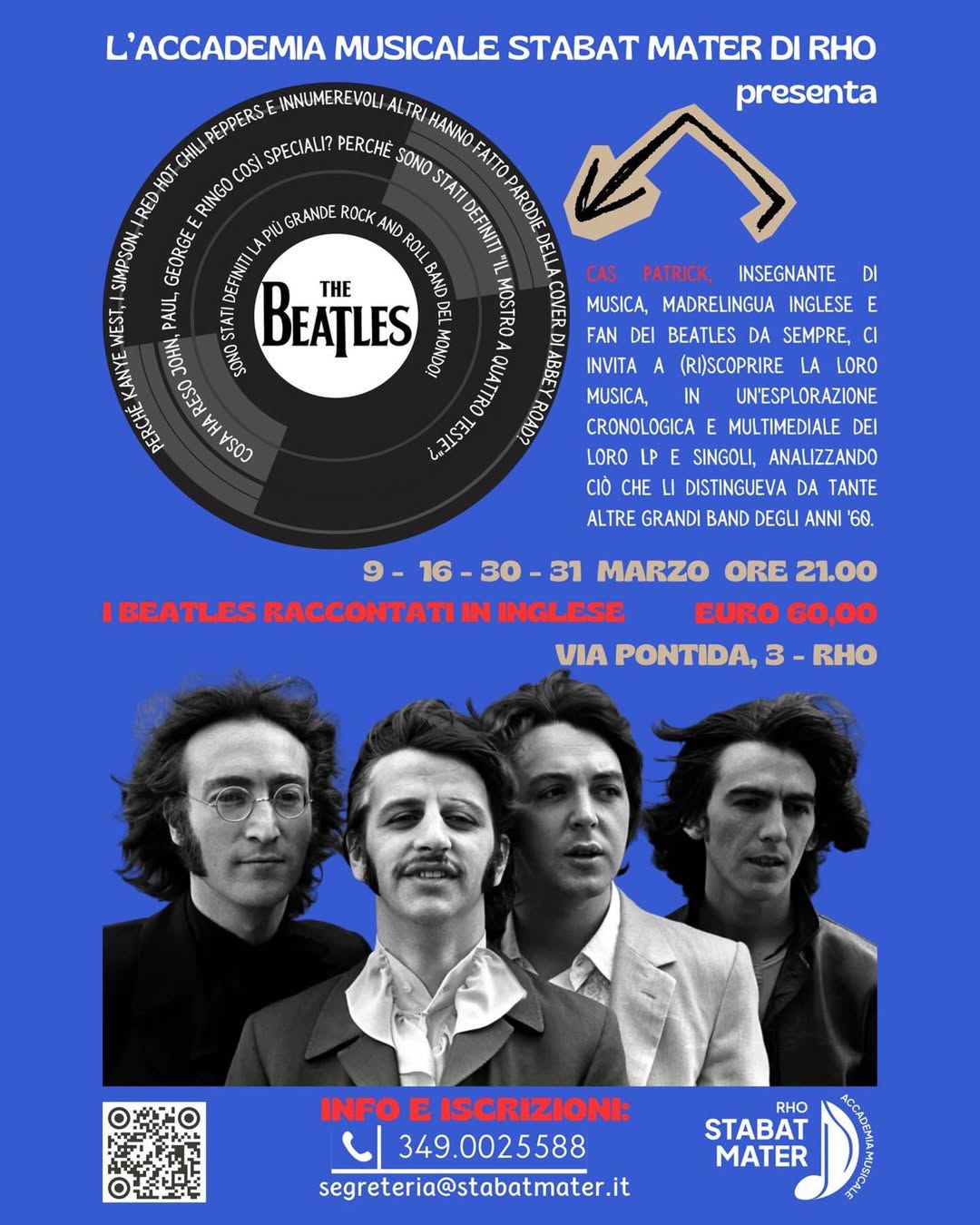 L’Accademia Musicale Stabat Mater di Rho presenta “I Beatles raccontati in inglese“. L’insegnante di musica Cas Patrick, madrelingua inglese e fan dei Beatles da sempre, ci invita in una serie di coinvolgenti lezioni a (ri) scoprire la loro musica, in un’esplorazione cronologica e multimediale dei loro LP e singoli, analizzando quali caratteristiche hanno permesso alla band inglese di passare alla storia e cosa li distingueva dagli altri grandi artisti degli anni ’60. Le lezioni si terranno nelle serate dei giorni 9, 16, 30 e 31 Marzo a partire dalle ore 21:00.