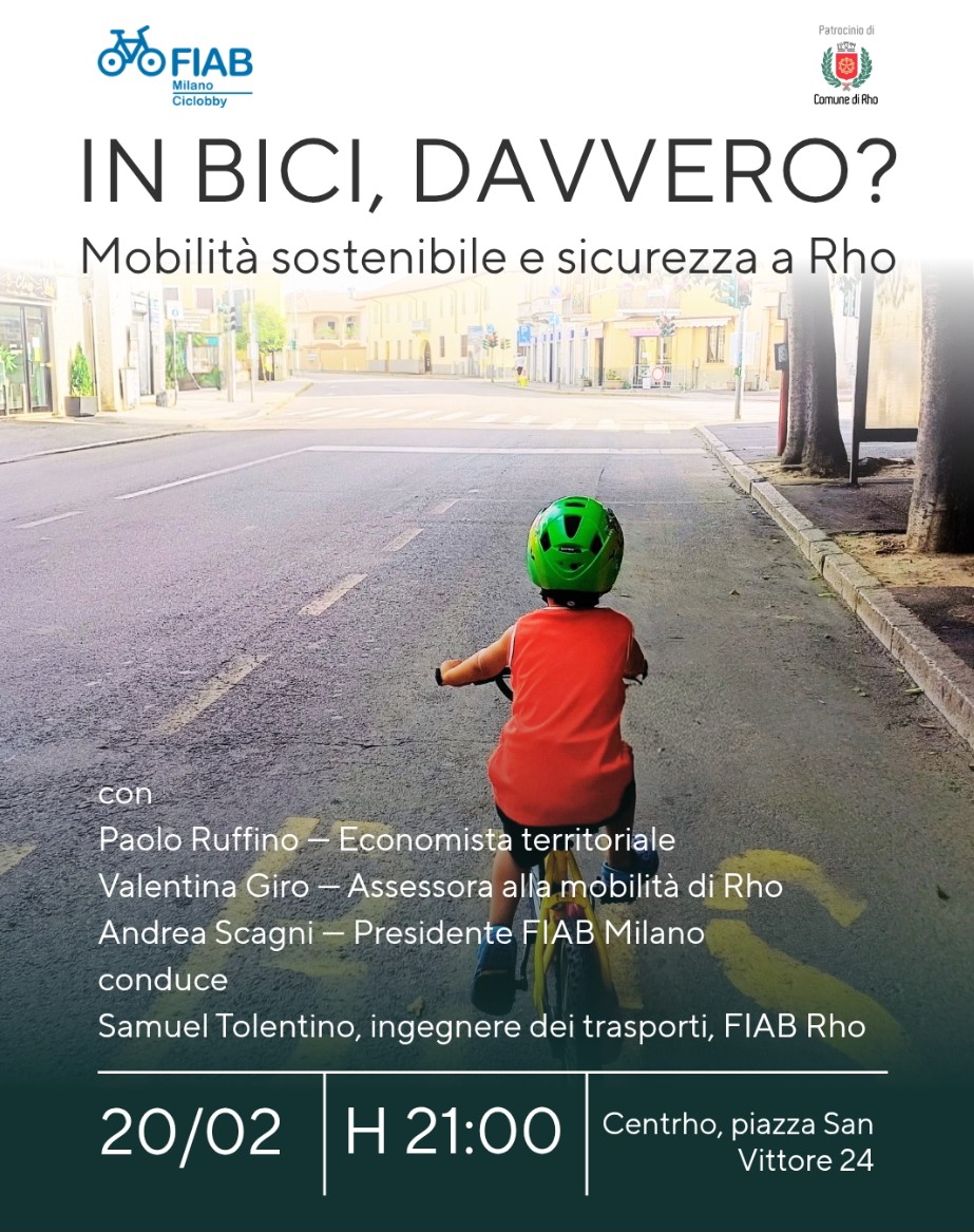 Venerdì 20 Febbraio, il Tourist Infopoint di Piazza San Vittore ospiterà alle ore 21:00 un incontro proposto dalla sezione di Rho di FIAB Milano Ciclobby APS, con il patrocinio del Comune di Rho, sul tema “In bici, davvero? Sostenibilità e sicurezza stradale a Rho “, una occasione di informazione e confronto dedicata al futuro della mobilità urbana e alla qualità dello spazio pubblico. Sono previsti interventi di Paolo Ruffino, economista territoriale, Valentina Giro, assessora alla Mobilità del Comune di Rho, ed Andrea Scagni, presidente di FIAB Milano. A moderare l’incontro sarà Samuel Tolentino, ingegnere dei trasporti e referente FIAB Rho. L’obiettivo è promuovere la mobilità sostenibile e far conoscere ai cittadini i progetti in corso sul territorio. Si parlerà di sicurezza stradale, mobilità ciclabile e della trasformazione delle città verso modelli più sostenibili. Sarà anche un momento di ascolto delle proposte e delle idee dei cittadini, invitati a esprimere il loro pensiero.
