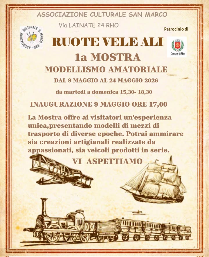 L’Associazione Culturale San Marco presenta “Ruote Vele Ali“, una mostra di modellismo amatoriale che offre ai visitatori un’esperienza unica, presentando modelli di mezzi di trasporto di diverse epoche in scala. I modellini esposti saranno sia creazioni artigianali realizzate da appassionati, sia veicoli prodotti in serie. La mostra verrà inaugurata Sabato 9 Maggio 2026 alle ore 17:00 e sarà visitabile fino a Domenica 24 Maggio, dalle ore 15:30 alle ore 18:30.